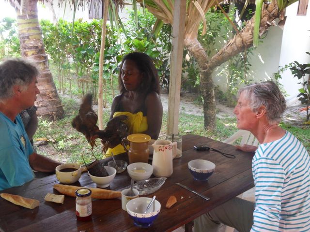 2013-Mada -- petit dejeuner au gite Geraldine va "faire un sort" a 2 poulettes!